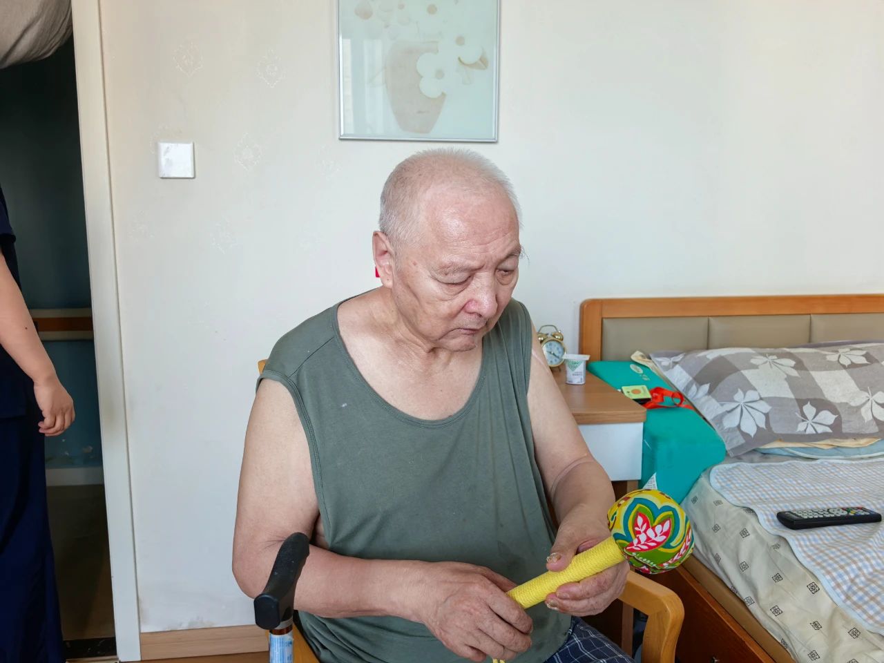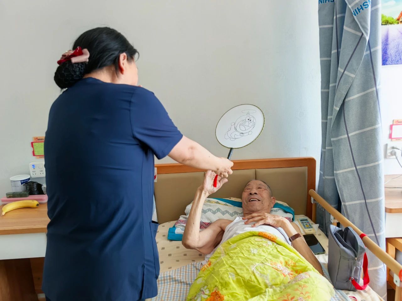 活动接近尾声时,工作人员带着精心准备的礼物:养生锤、经络梳还有精心制作的DIY团扇,来到未参加活动的老人房间,为他们送上节日的祝福。每到一个房间,老人们都露出了欣喜的笑容,接过礼物时,他们不住地感谢工作人员的细心和周到。