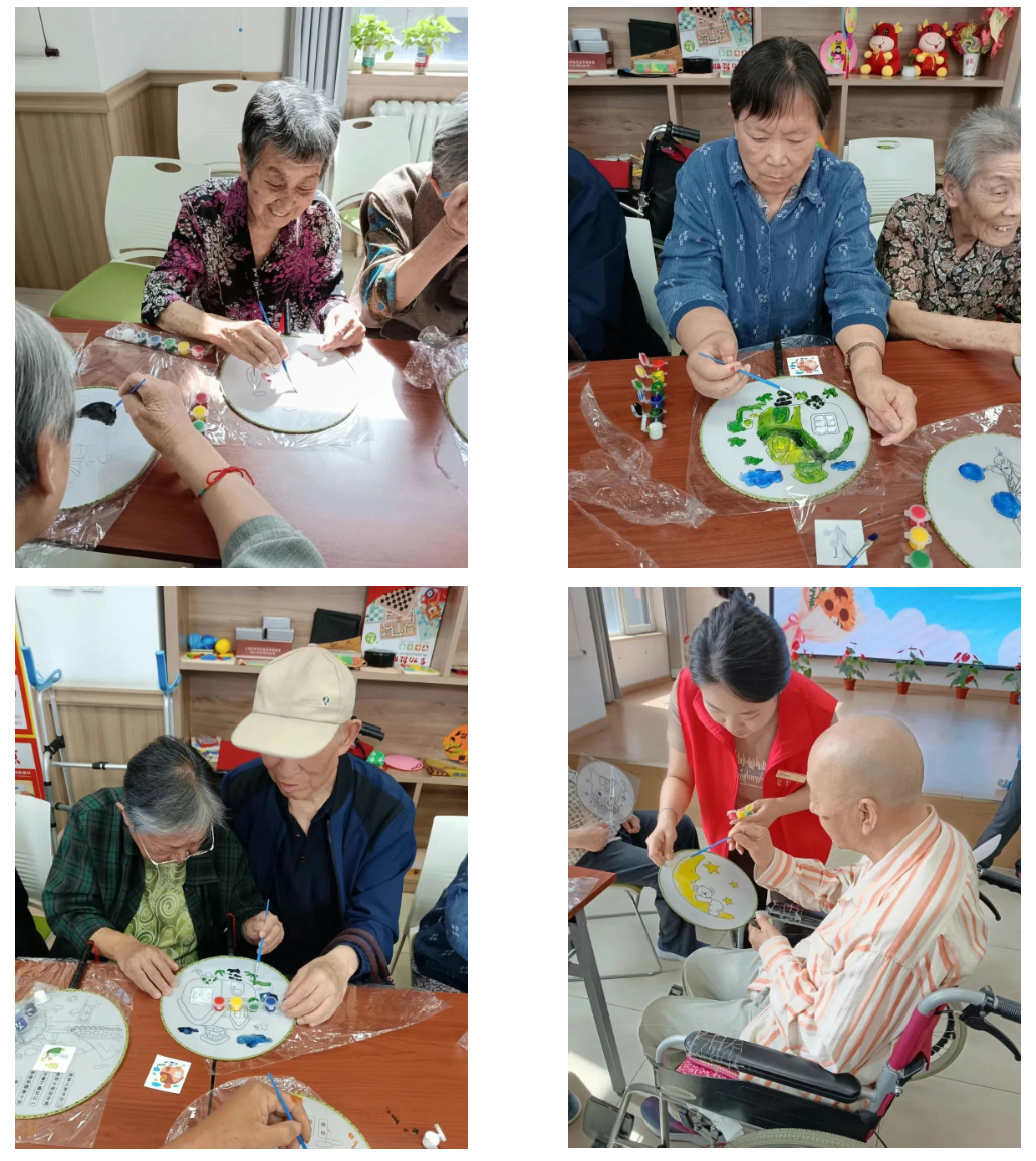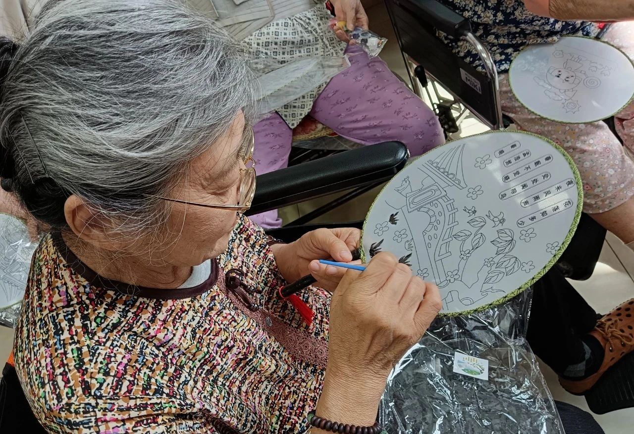 随后,活动进入了趣味手工环节——DIY扇子。工作人员提前准备好了各种材料,老人们在工作人员的协助下,开始动手制作属于自己的扇子。他们专注地挑选图案、用色彩鲜艳的颜料填充图片,彼此交流心得,欢声笑语不断。一把把独一无二的手工扇,不仅带来清凉,更承载着节日的喜悦与成就感。
