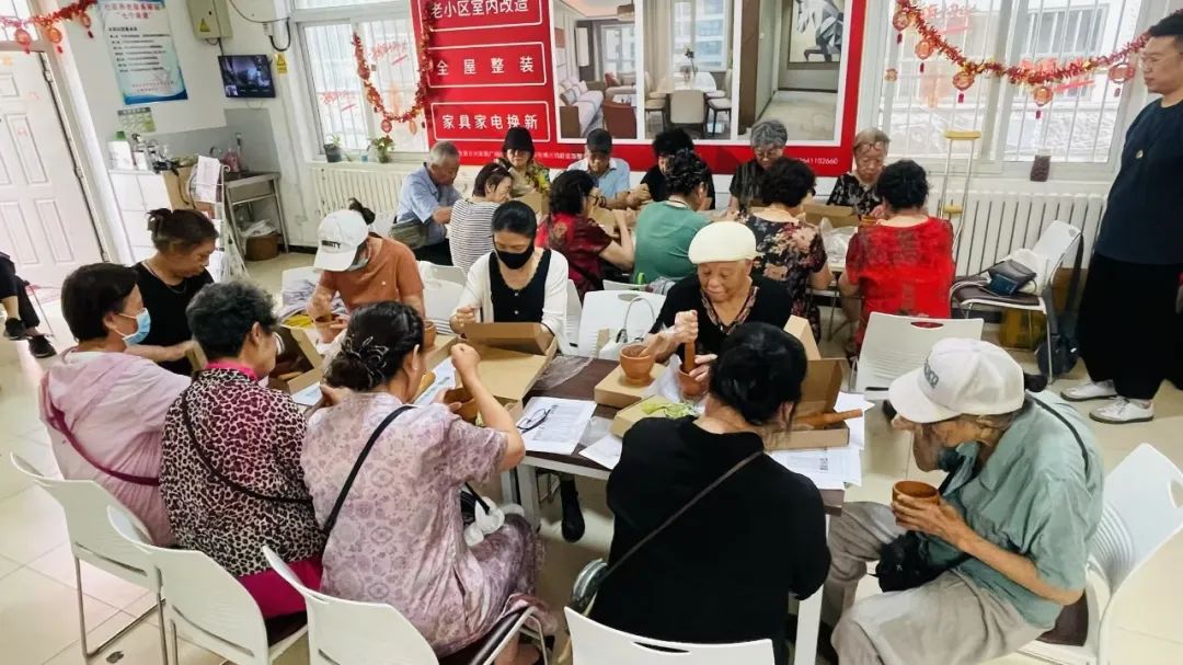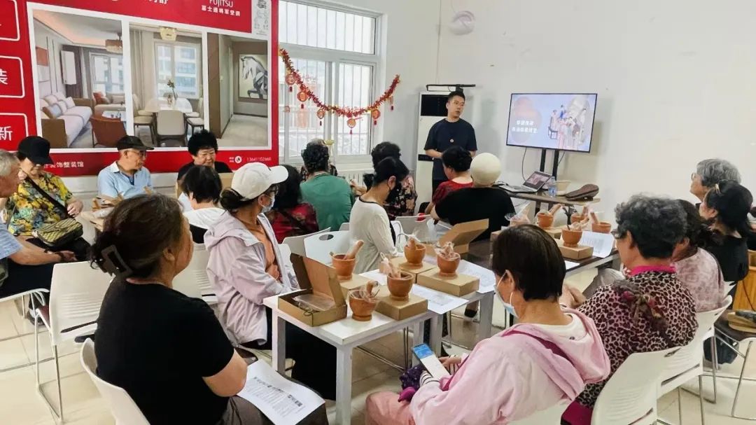 随后,在工作人员的引导下,老人们开始了香囊的制作。大家将“紫苏、陈皮、藿香、薄荷叶、佩兰、艾叶”等草药放入木质器皿罐中,伴随着阵阵捣药声,草药混合的芬芳弥漫开来。这一步骤看似简单,实则蕴含着对传统技艺的传承。木质器皿罐的使用,不仅能够更好地释放草药的香气,更让老人们亲身感受到了传统工具的独特魅力。